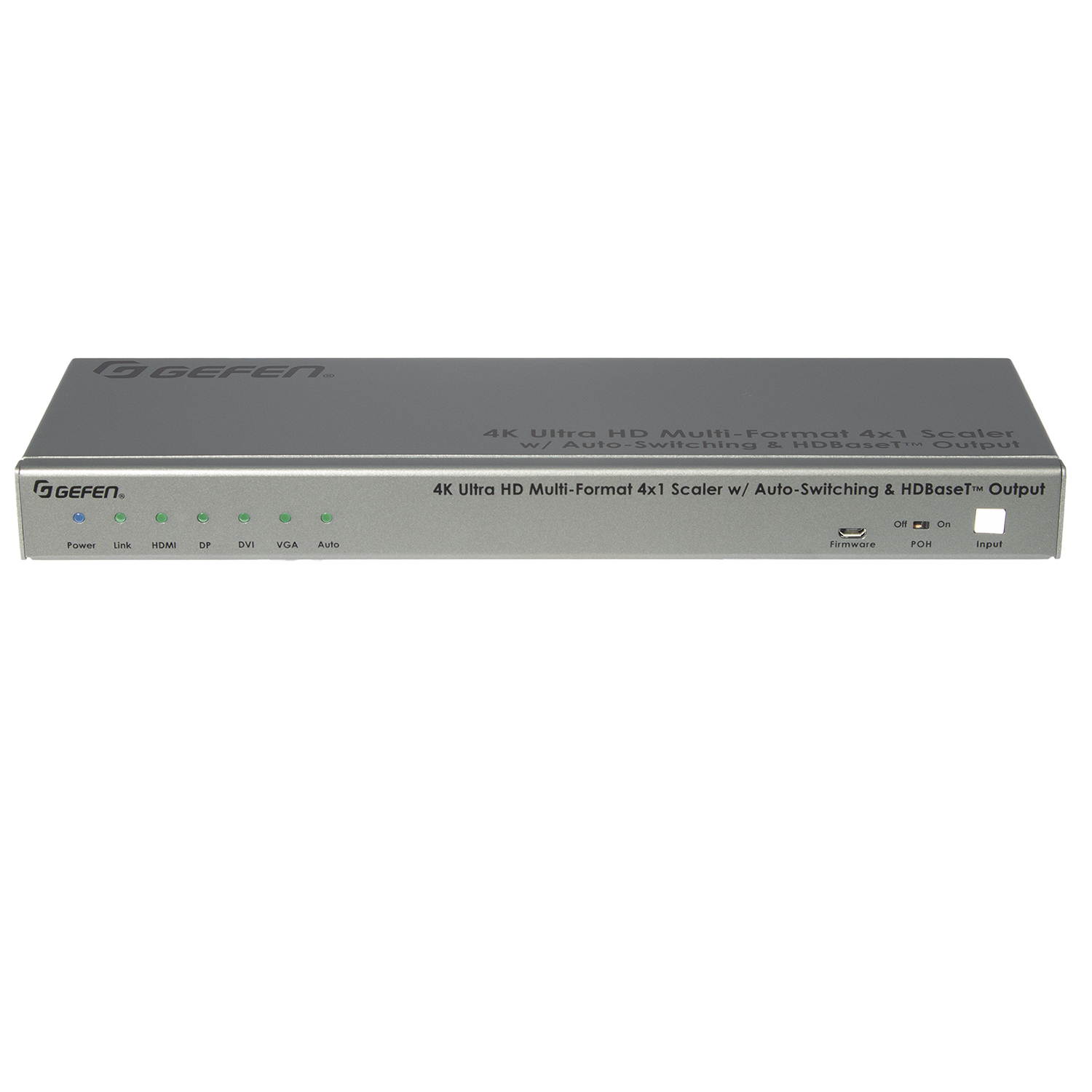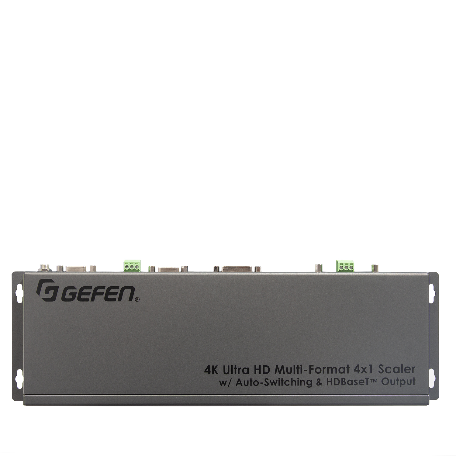 Gefen EXT-4K300A-MF-41-HBTLS 4K Ultra HD daudzformātu 4 × 1 mērogošanas ierīce ar automātisku pārslēgšanu un sadalītām HDMI un HDBaseT izvadēm.