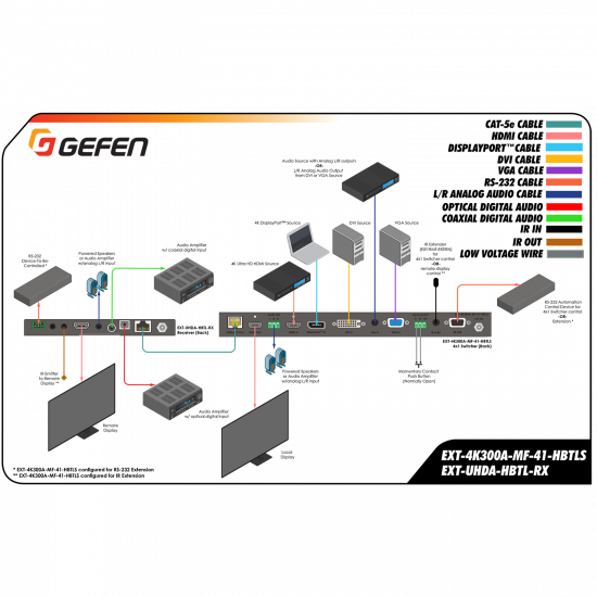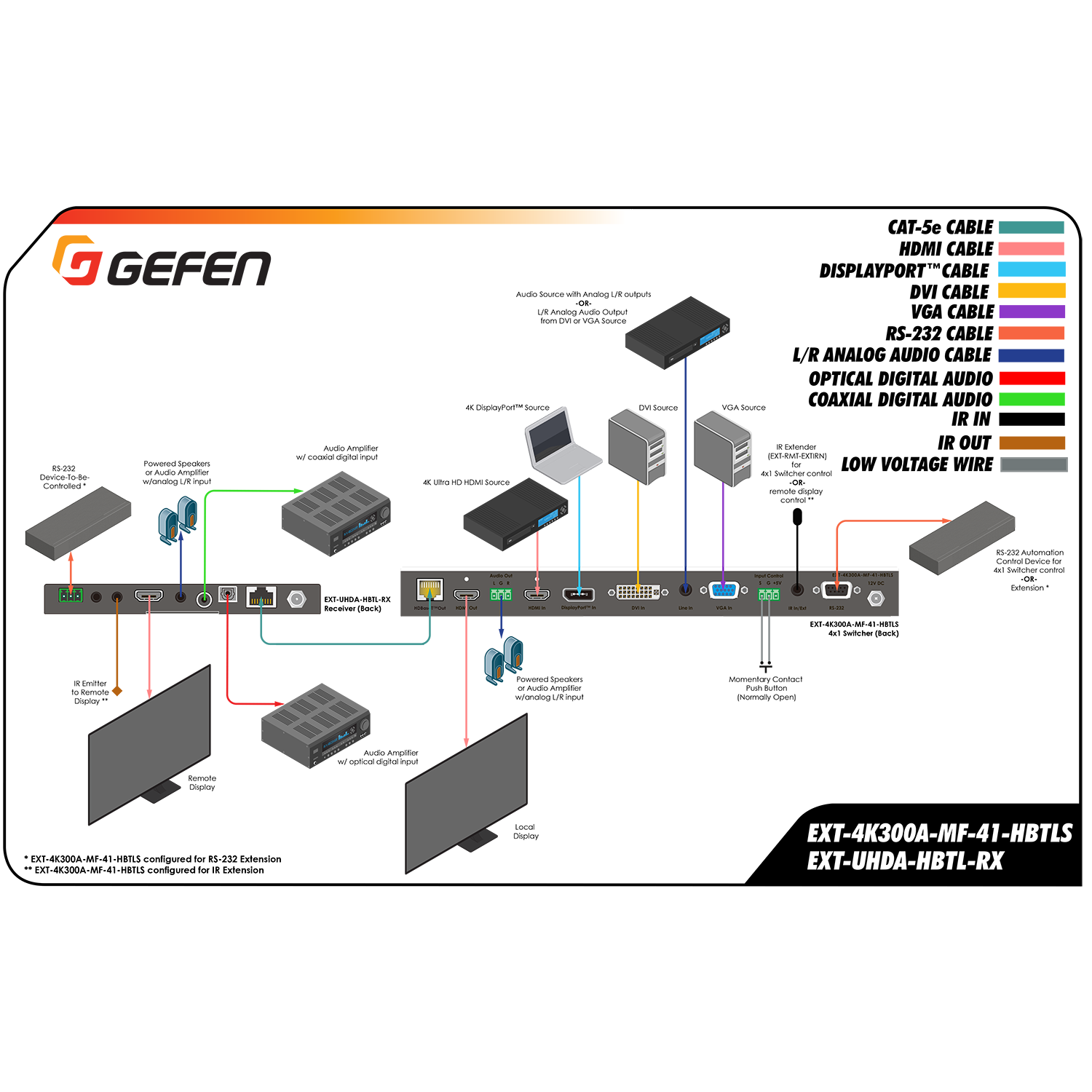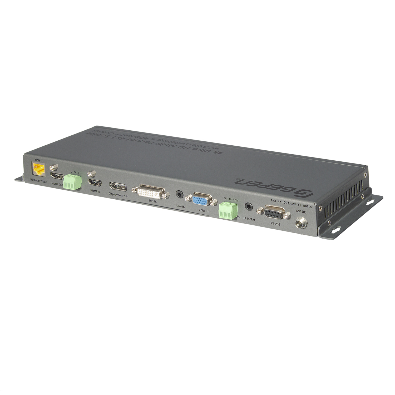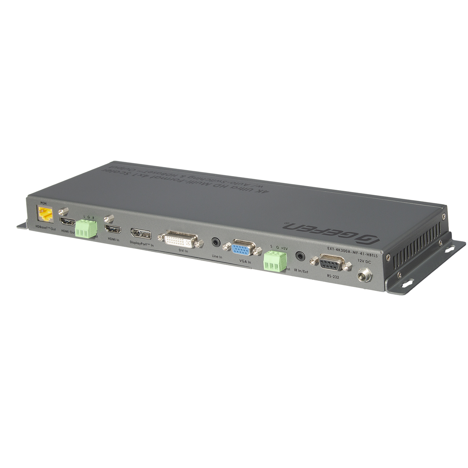 Gefen EXT-4K300A-MF-41-HBTLS ir 4 × 1 prezentāciju pārslēdzējs ar HDMI, DisplayPort, DVI un VGA ieejām, kā arī L/R analogo audio ieeju, kas papildina gan DVI, gan VGA ieeju. Tam ir dalītas HDMI/HDBaseT izejas un atņemta analogā L/R audio izeja. 4 ieejas var pārslēgt automātiski vai manuāli. Vadības iespējas ietver priekšējo paneli, rokas IR tālvadības pulti, elektrisko IR, RS-232 un kontaktu slēgšana. Sadalītās HDMI un HDBaseT izejas var vienlaikus rādīt uz lokālo un attālināti instalēto displeju, palielinot elastību lielākās prezentācijas telpās.