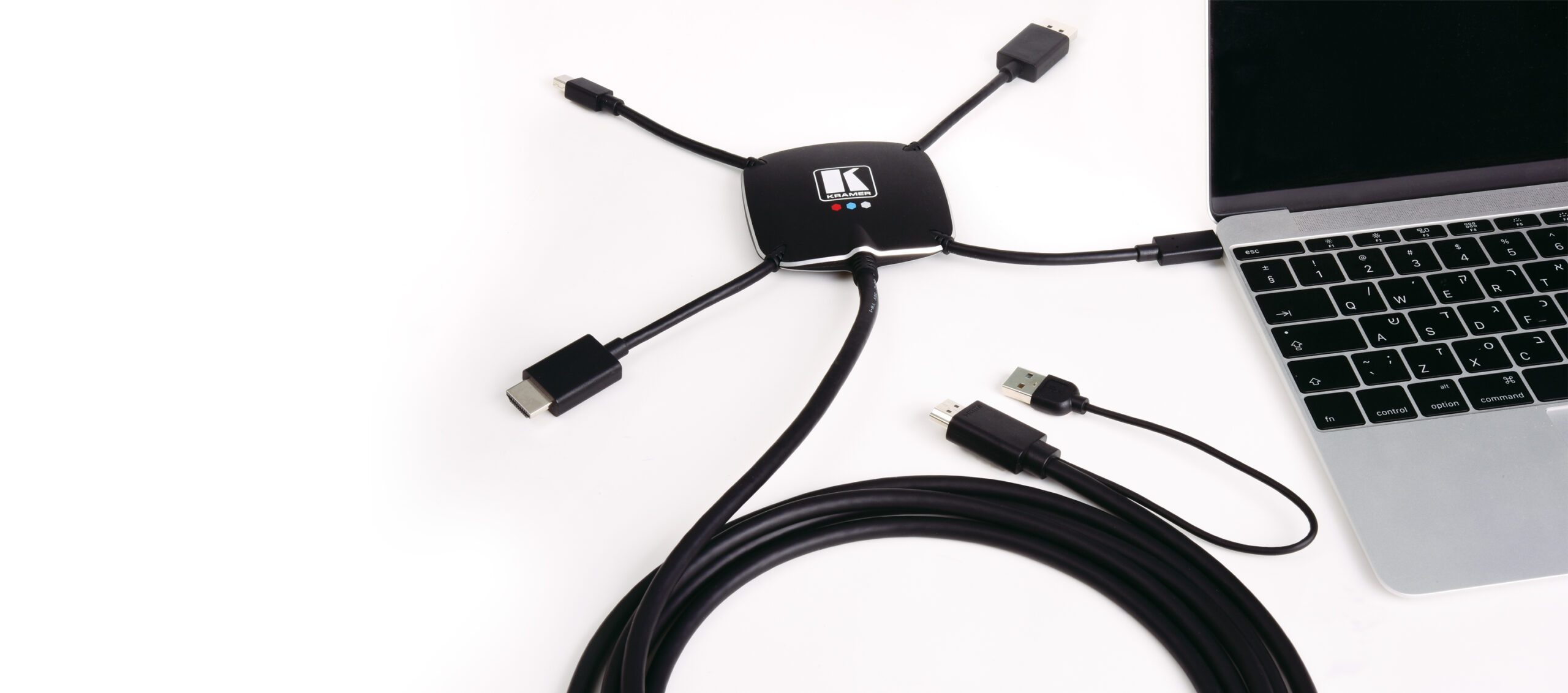 KRAMER K-SPIDER ir aktīva daudzformātu ieejas (M) – HDMI izejas (M) adapterī, kas ļauj savienot vienu HDMI, DisplayPort, mini DisplayPort vai USB Type-C avotu ar HDMI pieslēguma monitoru vai displeju.