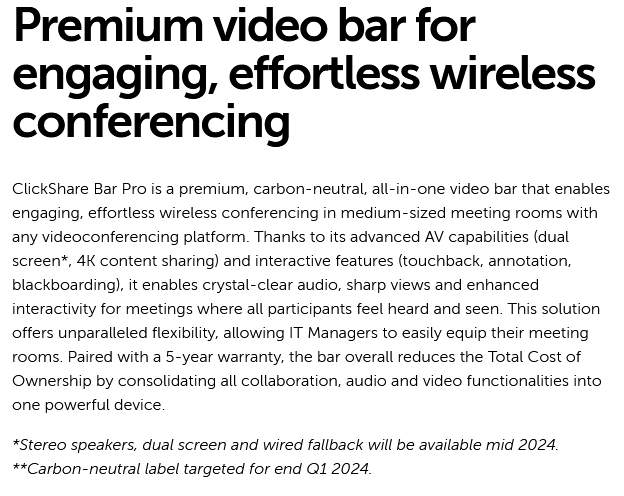 Augstas kvalitātes, CO2 neitrāla ClickShare All-in-One video josla Pro nodrošina bez piepūles – valdzinošas bezvadu konferences vidēja izmēra konferenču telpās — jebkurā videokonferenču platformā. Novatoriskās AV funkcijas (duālais ekrāns, 4K satura koplietošana) un interaktīvās funkcijas (skārienjutības, anotācijas, tāfeles funkcijas) nodrošina kristāldzidru skaņu, asus attēlus un uzlabotu interaktivitāti sapulču laikā. Visi dalībnieki jūtas dzirdēti un redzēti. Sistēma ir unikāli elastīga un palīdz IT vadītājiem viegli jaunināt savas sanāksmju telpas. Apvienojumā ar 5 gadu garantiju, ClickShare Bar Pro samazina ekspluatācijas izmaksas, apvienojot visas sadarbības, audio un video funkcijas vienā jaudīgā ierīcē.
