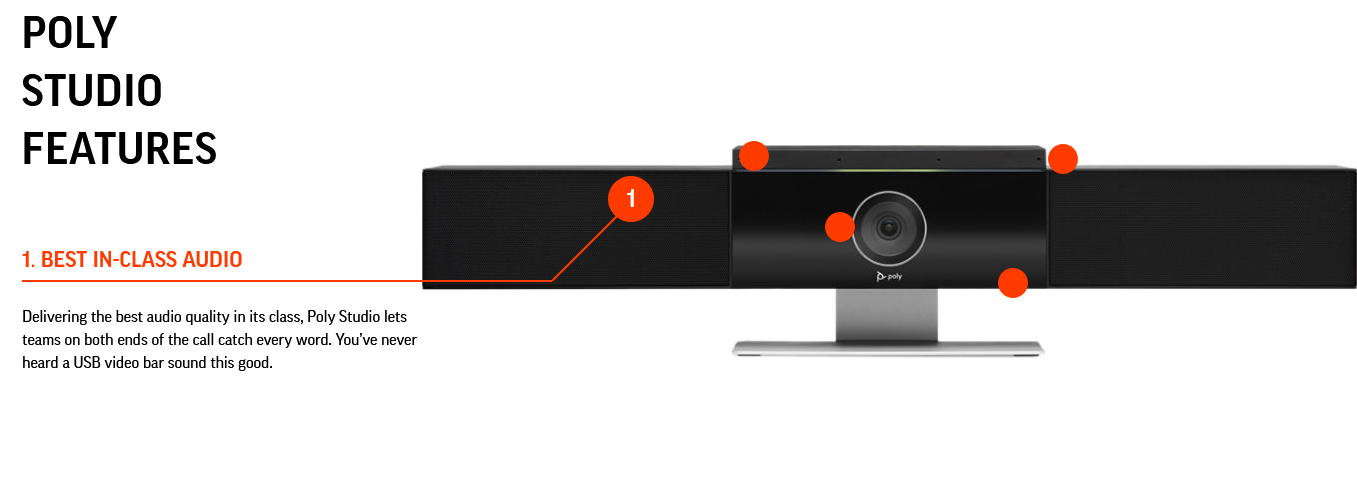 Jūs nekad neesat dzirdējis USB video joslu, kas skan tik labi. Jaudīgi stereo skaļruņi nodrošina, ka ikviens var dzirdēt. 6 mikrofonu bloks sniedz jums pārliecību, ka jūsu idejas būs skaidri redzamas. Ar Poly visi ir vienlīdzīgi sanāksmju dalībnieki.