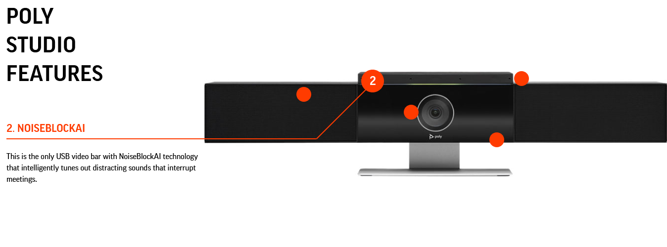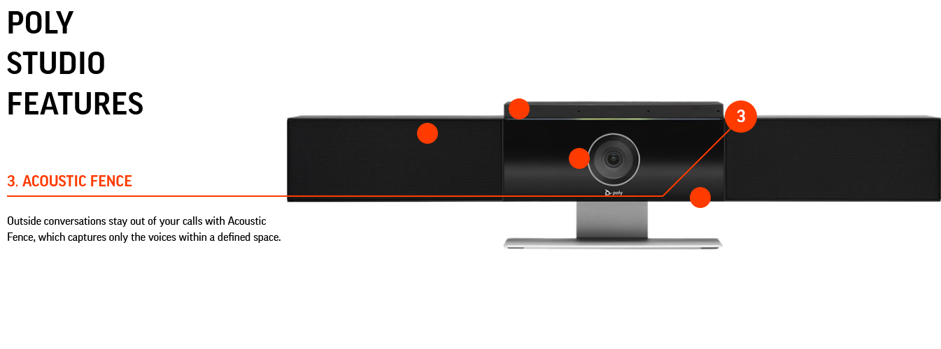 Poly NoiseBlockAI tehnoloģija gudri noregulē traucējošas skaņas, kas pārtrauc sanāksmes. Izmantojot Acoustic Fence tehnoloģiju, jūs nevarat sarunāties sarunās — tā uztver tikai balsis noteiktā telpā.
