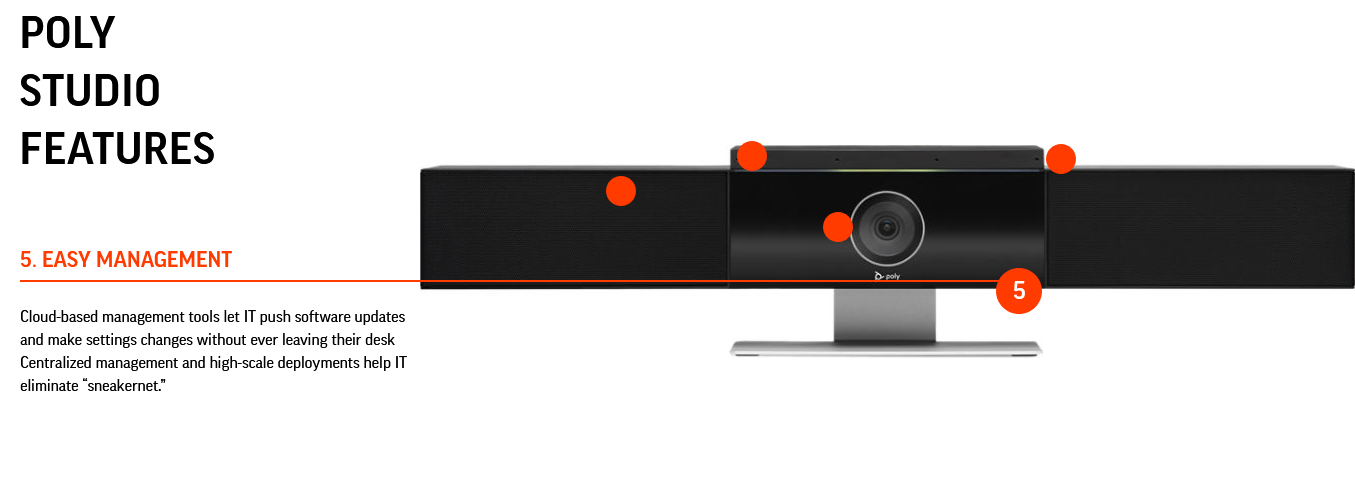 Pārvaldības rīki, piemēram, Poly Lens, mākoņa pārvaldības programmatūra, ļauj IT nospiest programmatūras atjauninājumus un veikt iestatījumu izmaiņas, nekad neizejot no darba galda. Centralizēta uz mākoņiem balstīta pārvaldība un liela mēroga izvietošana palīdz novērst laikietilpīgo IT “sneakernet”. Turklāt tas darbojas ar gandrīz jebkuru video platformu, padarot to drošu nākotnē.